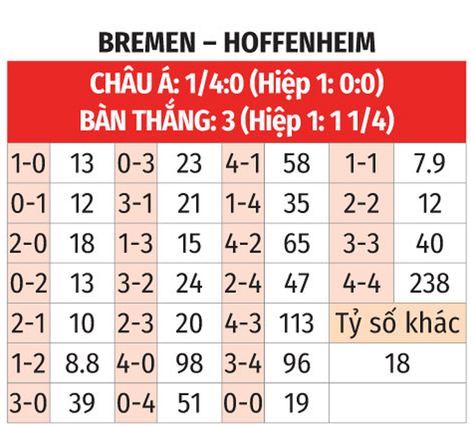 - Chẵn bàn thắng: 7/10 trận gần đây của Werder Bremen có tổng bàn thắng chẵn. Điều tương tự cũng tới ở 8/12 trận sân khách vừa xong của Hoffenheim.