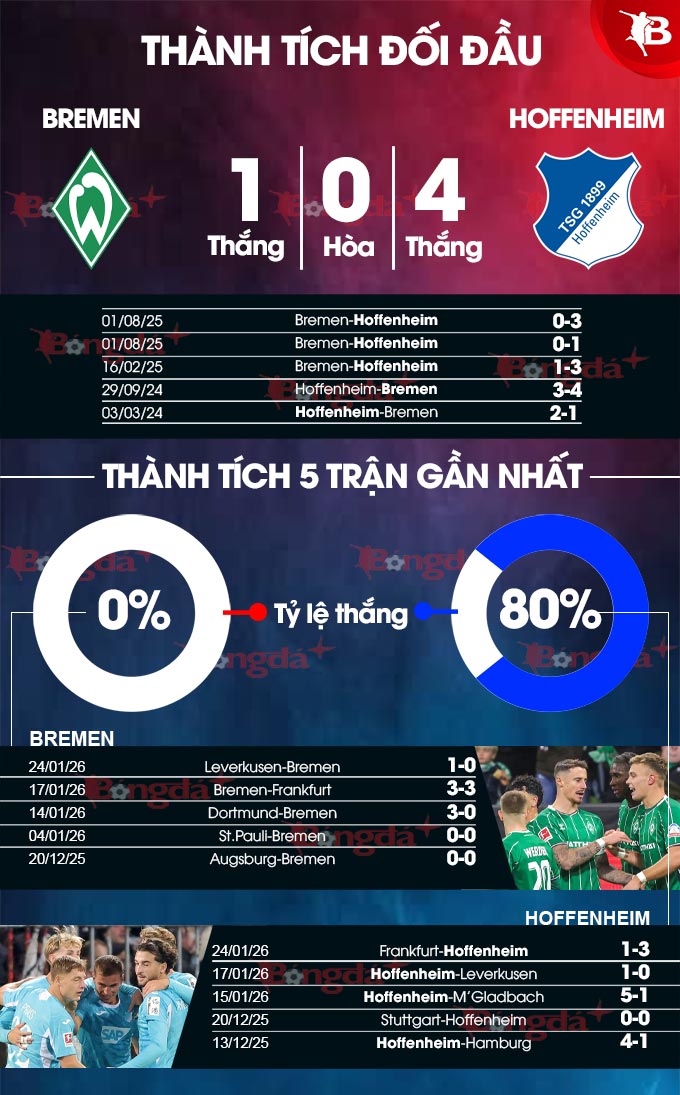 Bremen có lợi thế sân nhà nhưng họ chỉ thắng 3 tại đây kể từ khi mùa giải mới khởi tranh. Trong khi đó, Hoffenheim sở hữu đội hình chất lượng và đối đầu trực tiếp tốt hơn. Cụ thể, CLB này thắng 7/10 lần gần nhất chạm mặt Bremen.