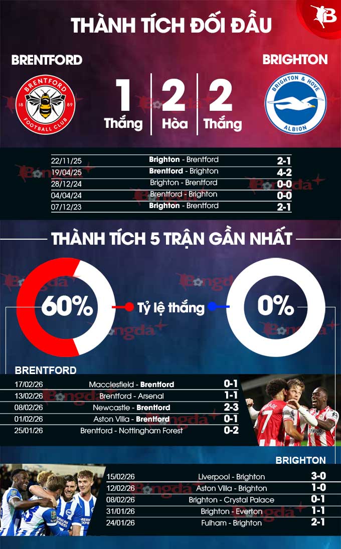 - Dưới 3 bàn: 6/7 trận gần đây của Brentford đều có dưới 3 bàn. 4 trận vừa qua của Brighton số bàn thắng cũng không hơn được 2.