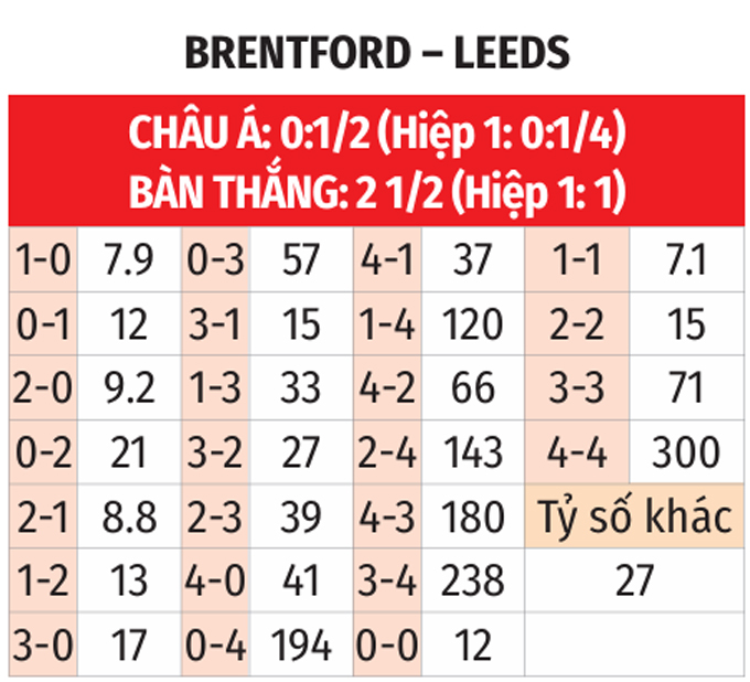 - Lưới rung 15 phút cuối: 4/6 trận gần đây so T giữa 2 CLB có bàn thắng từ phút 75 trở đi. Chưa hết, 4/5 trận mới đây của Brentford lẫn Leeds chung kịch bản.