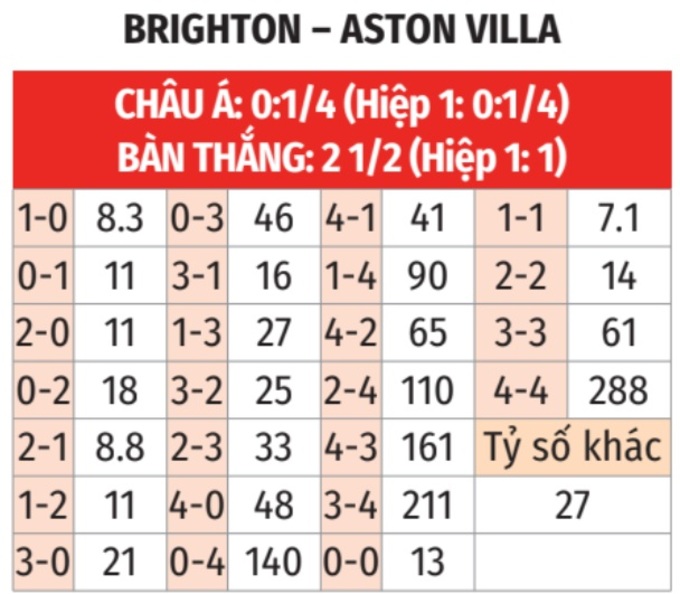 - Lẻ bàn thắng: 4/5 lần gặp nhau giữa 2 đội gần đây kết thúc với tổng bàn thắng là số lẻ. Tình trạng tương tự xảy ra ở 3 trận sân nhà gần đây của Brighton và 5/7 trận vừa qua của Aston Villa.