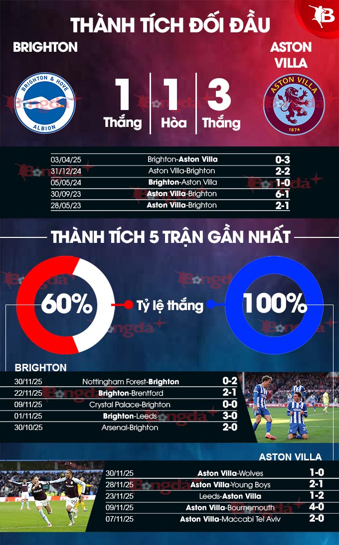 Nhưng Aston Villa vẫn có cơ sở để tự tin sẽ đánh bại Brighton để nối dài mạch thắng. Đó là sự ủng hộ của quá khứ. Theo thống kê, đội chủ sân Villa Park thắng 6 trận, hòa 1, chỉ phải nhận 1 thất bại trong 9 lần đối đầu với Chim mòng biển gần đây tại giải Ngoại hạng Anh. Trong đó, ở lần chạm trán gần nhất của trên sân Amex của Brighton, Aston Villa thắng vang dội 3-0.
