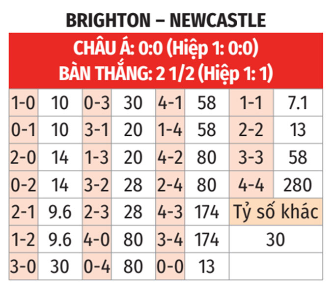 - Tỷ số chẵn: Cả 4 trận gần đây của Brighton đều kết thúc với tỷ số chẵn. 4/5 trận gần đây giữa đội bóng này và Newcastle cũng có số bàn thắng chia hết được cho 2.
