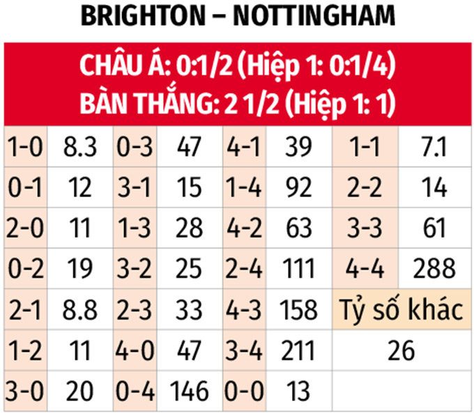 • Nhiều nhất 1 bàn hiệp 1: 9/10 trận gần đây của Brighton cùng 3/4 trận vừa qua của Nottingham có tối đa 1 bàn thắng được ghi trong 45 phút đầu. 2 trận đối đầu gần nhất giữa đôi bên chỉ có 1 bàn thắng trong hiệp 1.