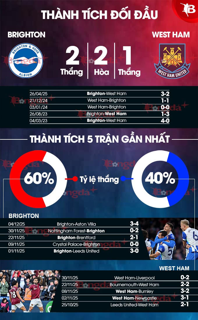 Đã có phong độ tốt hơn, Brighton còn được lịch sử ủng hộ khi giành tới 4 chiến thắng mà chỉ thua 1 trong 7 cuộc đụng độ West Ham gần đây. Đáng chú ý, Brighton đã chọc thủng lưới West Ham tới 31 bàn chỉ tính riêng tại Premier League.