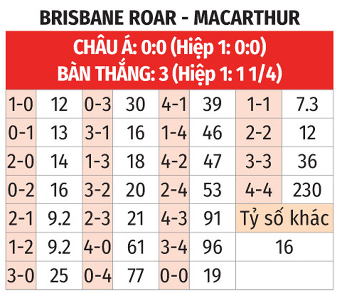 - Lẻ bàn thắng: 7/10 trận gần nhất của Brisbane Roar có tổng bàn thắng không chia hết cho 2. Ngoài ra, 5/7 trận chính thức vừa qua của Macarthur chứng kiến điều tương tự.