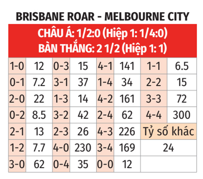 - Tỷ số lẻ: Cả 3 trận gần đây giữa Brisbane Roar và Melbourne City đều kết thúc với tỷ số lẻ. 3/4 trận vừa qua của Brisbane Roar cũng có số bàn thắng không chia hết được cho 2.