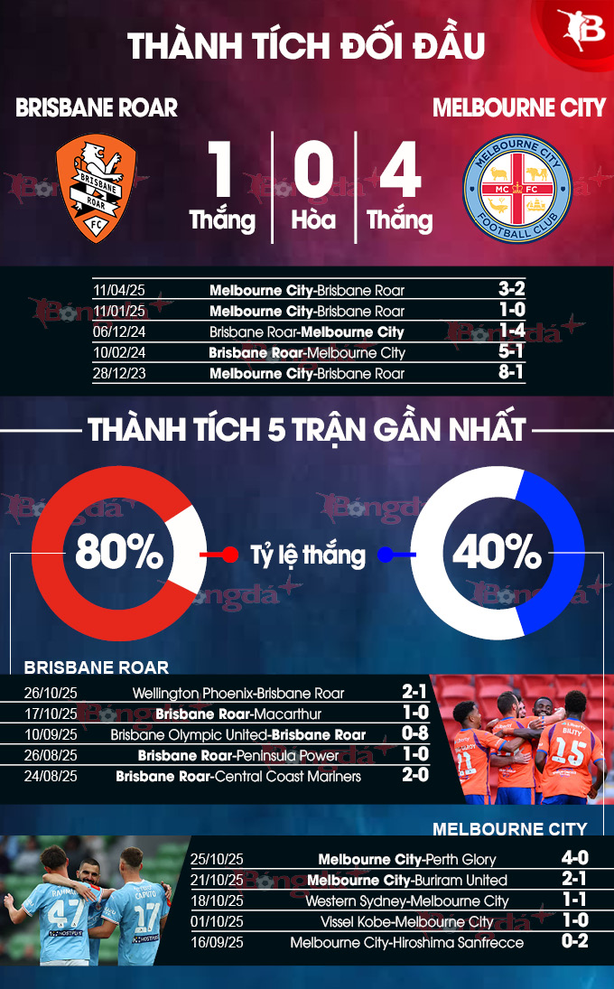 - Tối thiểu 3 bàn: 3/4 trận sân khách gần đây của Melbourne City ở giải VĐQG Australia đều có tối thiểu 3 bàn. 4/5 trận gần nhất giữa đội bóng này và Brisbane Roar số lần lưới rung còn đều chạm ngưỡng 5.