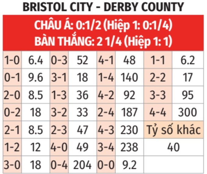 - Tối thiểu 1 bàn hiệp 1: 6 lần đối đầu giữa 2 đội gần đây đều có từ 1 bàn thắng trở lên trong hiệp 1. Tình trạng tương tự xảy ra ở 7/9 trận gần đây của Bristol City và 8/10 trận vừa qua của Derby County.
