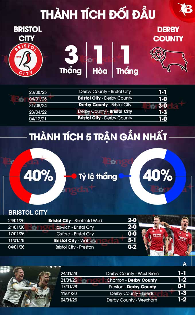 Bristol City bước vào trận đấu này với sự ủng hộ của lịch sử. Thống kê chỉ ra rằng, trong 4 lần gần đây tiếp đón Derby County trong khuôn khổ giải hạng Nhất Anh, họ toàn thắng. Trong đó ở 3 lần gần nhất, họ không để đội khách chọc thủng lưới.