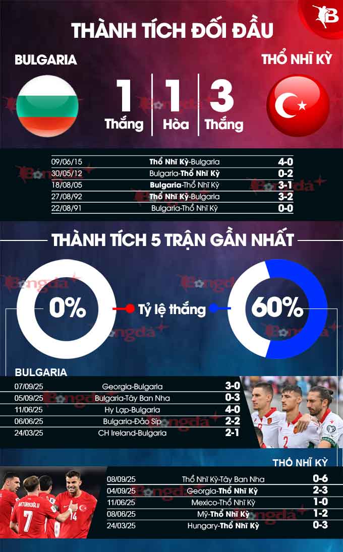 Hơn nữa, sau thất bại thảm hại 0-6 trên sân nhà trước Tây Ban Nha ở lượt trận trước, Thổ Nhĩ Kỳ hiểu rõ tầm quan trọng của việc đáp trả ngay lập tức. Với mục tiêu tìm lại sức mạnh tại vòng loại World Cup, đoàn quân của HLV Vincenzo Montella chắc chắn muốn tận dụng cơ hội trước một Bulgaria đang khủng hoảng để hoàn tất nhiệm vụ.