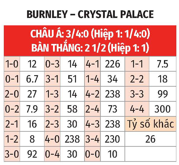 - Chẵn bàn thắng: 3/4 trận đối đầu trước đó giữa Burnley và Crystal Palace có tổng bàn thắng chia hết cho 2. Ngoài ra, 3/4 trận vừa xong của Burnley lẫn Crystal Palace đều chứng kiến điều tương tự.