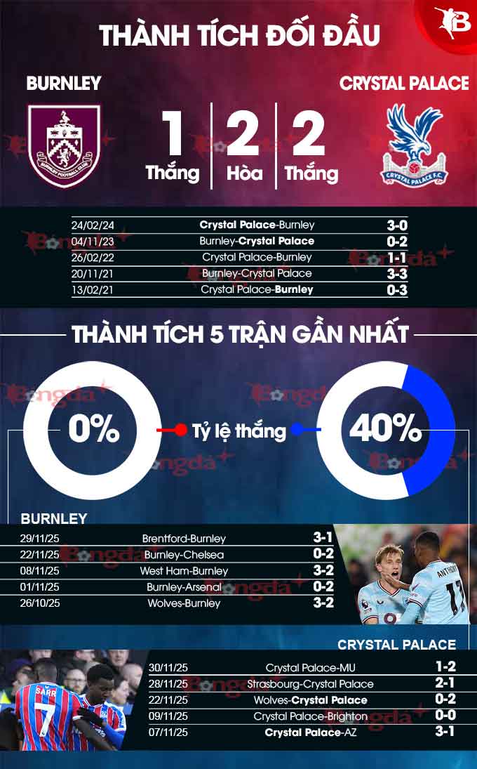 Dù thế, đó chỉ là lý thuyết bởi phong độ của Burnley hiện tại rất tệ. Họ thua 4 trận liên tiếp ở Ngoại hạng Anh còn Palace khá hơn khi thua 2, hòa 1 và thắng 1.