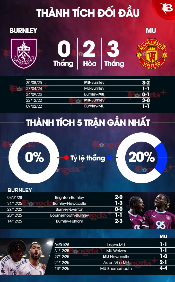 Sân Turf Moor chưa bao giờ là điểm tựa dành cho Burnley ở những trận đấu mà họ tiếp đón các cầu thủ MU tại đấu trường Ngoại hạng Anh, khi không thắng 8 trận liên tiếp gần đây, trong đó nhận tới 6 thất bại, trong đó có 7 trận không ghi được bàn.