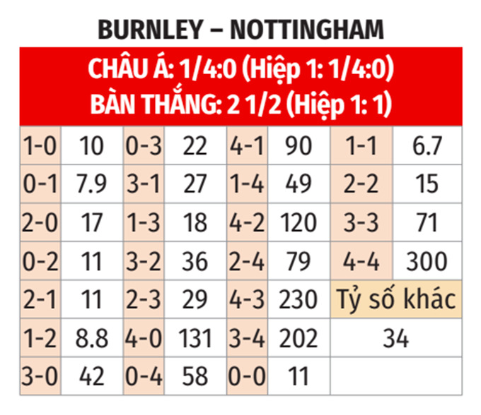 - Lẻ bàn thắng: 3/4 cuộc đối đầu gần nhất (trừ giao hữu), 7/8 trận gần đây của Burnley và cả 3 trận vừa qua của Nottingham đều có tổng bàn thắng là lẻ. Ngoài ra, 8/11 cuộc đối đầu gần đây tại Burnley và 6/8 trận sân nhà gần nhất của Burnley đều có tổng bàn thắng không chia hết cho 2.