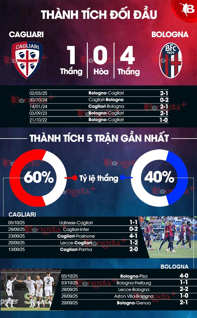 - Chẵn bàn thắng: 3/5 trận gần nhất của Cagliari có tổng bàn thắng chia hết cho 2. Ngoài ra, 3 trận vừa qua của Bologna cũng chứng kiến điều tương tự.