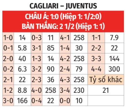 - Juve thắng theo châu Á: Juve nhường 1 bàn, Lão phu nhân thắng theo châu Á 6/7 trận chính thức gần đây ở các giải đấu nội địa khi là đội chiếu trên. Trong 16 lần chạm trán gần nhất giữa đôi bên trên đảo Sardegna, Juve thắng tới 13 trận nếu không xét tới thành tích theo châu Á. 6 trận sân nhà vừa qua ở Serie A khi là đội chiếu dưới, Cagliari thua tới 5 trận.