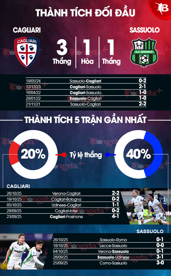 Trong khi đó, Cagliari muốn nhân cơ hội đụng độ đối thủ dễ chịu Sassuolo để chấm dứt chuỗi 4 trận không thắng (2 hòa, 2 bại) tại Serie A. Trước chuỗi trận này, Cagliari thi đấu khá ấn tượng với 2 trận hòa, 3 chiến thắng và chỉ 1 trận thua ở 6 tận chính thức.