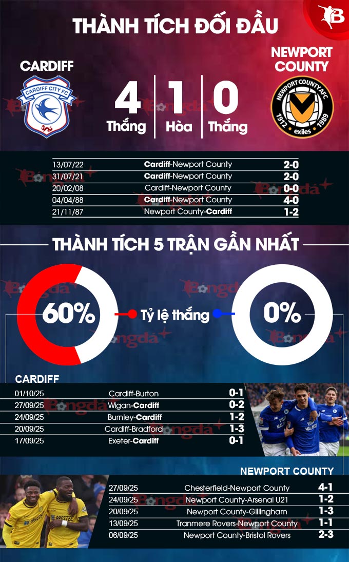 Quá khứ cũng ủng hộ Cardiff. Họ áp đảo trước Newport County trong 5 lần đối đầu gần đây với thành tích 4 thắng và 1 hòa. Đặc biệt, ở 4 lần chạm trán gần nhất, Cardiff không để cho đối phương ghi được bàn thắng danh dự. Điều này chắc chắn sẽ tiếp thêm sự tự tin cho các học trò của HLV Newport County.