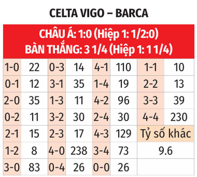 - Ít nhất 1 bàn ở hiệp 1: 5 trận chính thức gần nhất giữa Celta Vigo vs Barca có tối thiểu 1 lần lưới rung hiệp 1. 4/5 trận chính thức vừa xong của Celta Vigo và 5 trận mới đây của Barca có kịch bản tương tự. NHM nên đợi sau 15 phút đầu thì đặt niềm tin vào nhiều bàn hiệp 1.