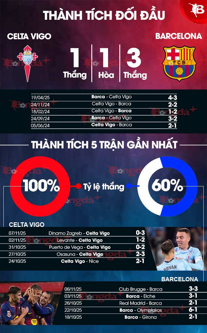 5 trận so T gần đây giữa Celta Vigo vs Barca có nhiều bàn thắng. Có cả thảy 22 bàn được ghi ở thời gian này, trung bình 4,4 bàn mỗi trận.