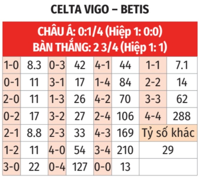 - X góc hiệp 1: 3/4 trận đấu gần đây của cả Celta Vigo lẫn Betis đều chỉ có tối đa 4 quả phạt góc trong hiệp 1. Trận đấu giữa 2 đội lần này sẽ không ngoại lệ.