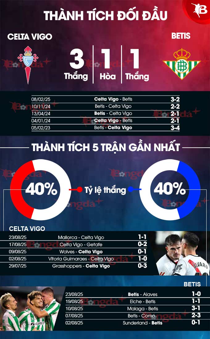Với đội bóng đang chưa thể bắt nhịp với mùa giải mới như vậy, Betis có cơ sở để tin tưởng sẽ có điểm ra về. Tất nhiên, đây sẽ là trận đấu không hề dễ dàng với đội bóng đến từ Seville. Bởi trong quá khứ, Celta Vigo thường xuyên át vía họ. Cụ thể, trong 8 lần đụng độ gần đây giữa hai đội, Betis thắng 5, hòa 2, chỉ phải nhận duy nhất 1 thất bại.
