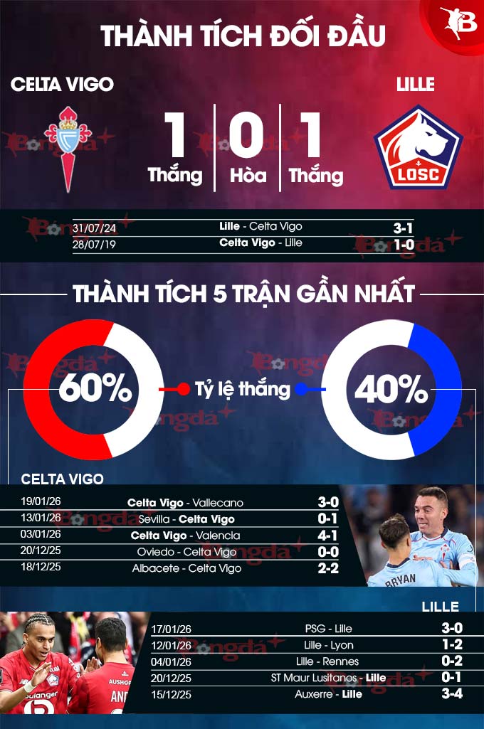 - Tổng bàn thắng là lẻ: Cả 3 trận gần nhất của Celta Vigo và 7/8 trận vừa qua của Lille đều khép lại với tổng bàn thắng là lẻ. Không những thế, 5/7 trận sân nhà gần nhất của Celta Vigo và 5/6 chuyến làm khách vừa qua cũng kết thúc với tổng bàn thắng không chia hết cho 2.