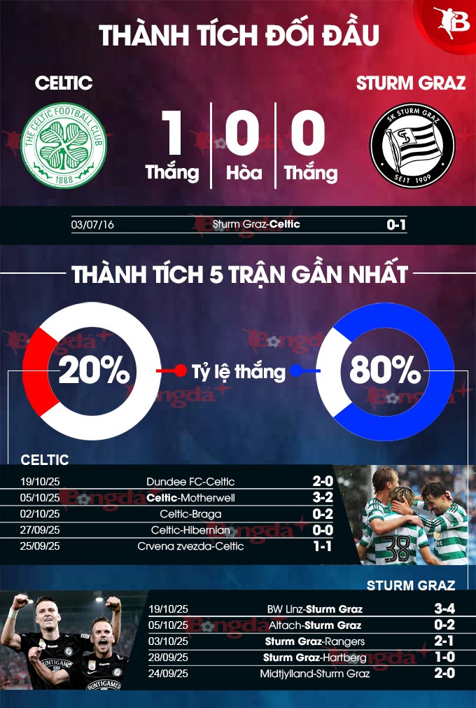 - Tối đa 2 bàn thắng: 6/9 trận gần đây của Celtic cùng 6/8 trận vừa qua của Sturm Graz đều có tối đa 2 bàn thắng. Trận đối đầu gần nhất giữa hai đội có tỷ số tối thiểu.