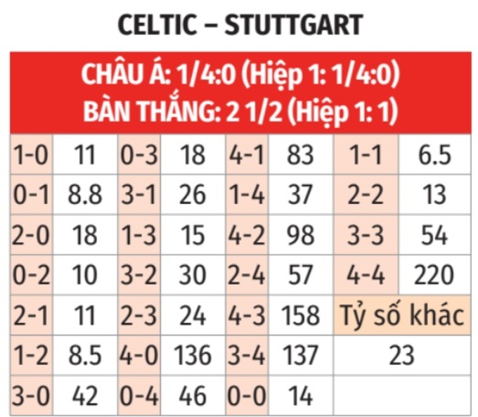 - Lẻ bàn thắng: 5/6 trận gần đây của Stuttgart kết thúc với tổng số bàn thắng là số lẻ. Tình trạng tương tự xảy ra ở 2 trận đấu vừa qua của Celtic.