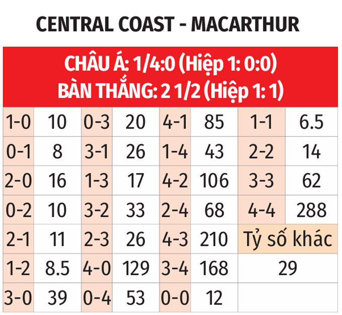 - Lẻ bàn thắng: 5/8 trận đối đầu vừa qua giữa 2 CLB có tổng bàn thắng không chia hết cho 2. Ngoài ra, 6/9 trận vừa xong của Central Coast Mariners cùng 6/10 trận mới đây của Macarthur FC đều chứng kiến điều tương tự.