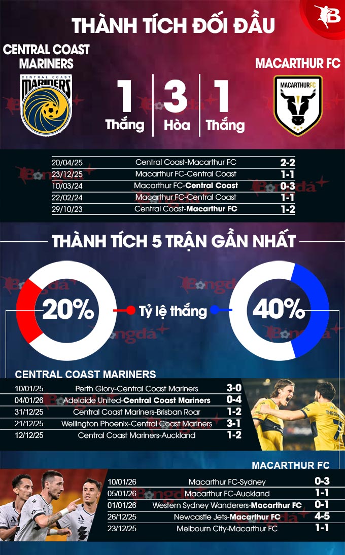 Trên BXH giải VĐQG Australia 2025/26, Central Coast Mariners đang đứng bét bảng với 11 điểm sau 12 vòng đấu. Lúc này, họ đang kém nhóm dự vòng tứ kết (dành cho các đội xếp từ thứ 3-6) tranh chức vô địch giải VĐQG Australia mùa này đúng 6 điểm. Mọi thứ chưa phải đã hết với Central Coast Mariners nhưng ở vòng này, họ khó có thể làm nên điều gì to tát khi gặp đối thủ được đánh giá cao hơn là Macarthur.