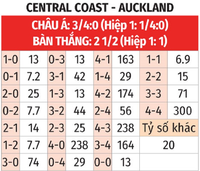 - Tối đa 3 bàn thắng: 5/6 trận gần đây của Central Coast cùng 10/11 trận vừa qua của Auckland FC đều có tối đa 3 bàn thắng được ghi. Với những gì hai đội đang thể hiện, kịch bản có nhiều nhất 3 pha làm bàn khả năng sẽ xuất hiện.