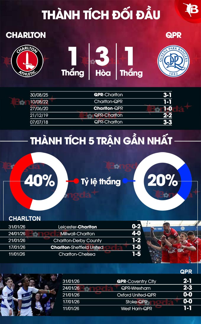 Nhận định bóng đá trận Charlton vs QPR diễn ra vào lúc 03h00 ngày 7/2 ở vòng 31 hạng Nhất Anh 2025/26. Bongdaplus phân tích thông tin lực lượng, đội hình dự kiến, dữ liệu chuyên sâu, dự đoán tỉ số.
