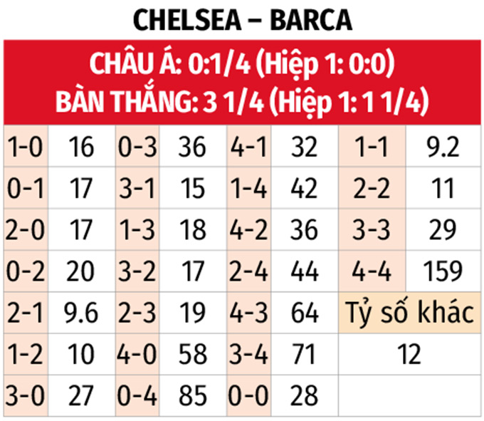 - Nhiều bàn thắng: Những trận đấu có sự góp mặt của Chelsea thời gian qua thường diễn ra với thế trận rất cởi mở và hấp dẫn, khi 7/9 trận gần đây đều có từ 3 bàn thắng trở lên. Với Barca, 5/6 trận vừa qua của đội khách thậm chí còn có tối thiểu 4 pha làm bàn. Ngoài ra, 4/5 trận đối đầu gần nhất cũng có tối thiểu 3 pha làm bàn.