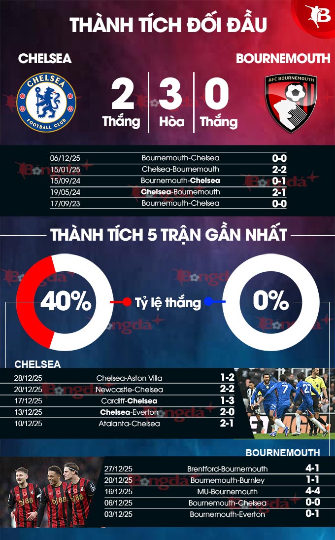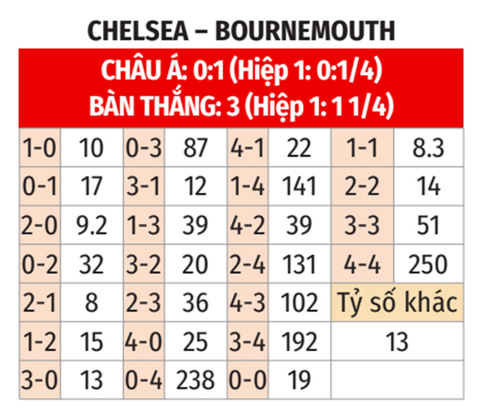 - Chẵn bàn thắng: 5/7 cuộc đối đầu gần nhất, 6/8 trận vừa qua của Chelsea và 11/14 trận gần đây của Bournemouth đều có tổng bàn thắng là chẵn. Hơn nữa, 7/10 chuyến làm khách vừa qua của Bournemouth cũng khép lại với tổng bàn thắng chia hết cho 2.