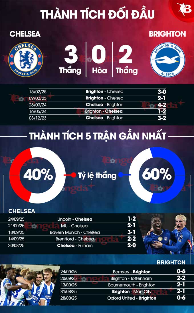 Thế nhưng, Brighton lại thắng 3 trong 6 lần gặp Chelsea gần nhất tại Ngoại hạng Anh (3 bại), sau khi không thắng trận nào ở 14 trận trước đó (hòa 4, thua 10). Chim mòng biển cũng có thành tích ấn tượng ở 5 trận đấu gần nhất với 3 chiến thắng, 1 trận hòa và chỉ 1 thất bại.