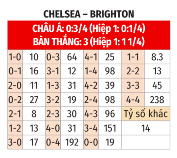 - Brighton thắng theo châu Á: Brighton thắng cả 2 cuộc chạm trán gần nhất, thắng 8/12 trận gần đây tại Ngoại hạng Anh và thắng 7/10 chuyến xa nhà vừa qua. Còn Chelsea thua cả 4 trận gần đây, thua 6/8 trận sân nhà gần nhất (trừ giao hữu). Do đó, giới mộ điệu có thể đặn niềm tin vào Brighton ở trận này.