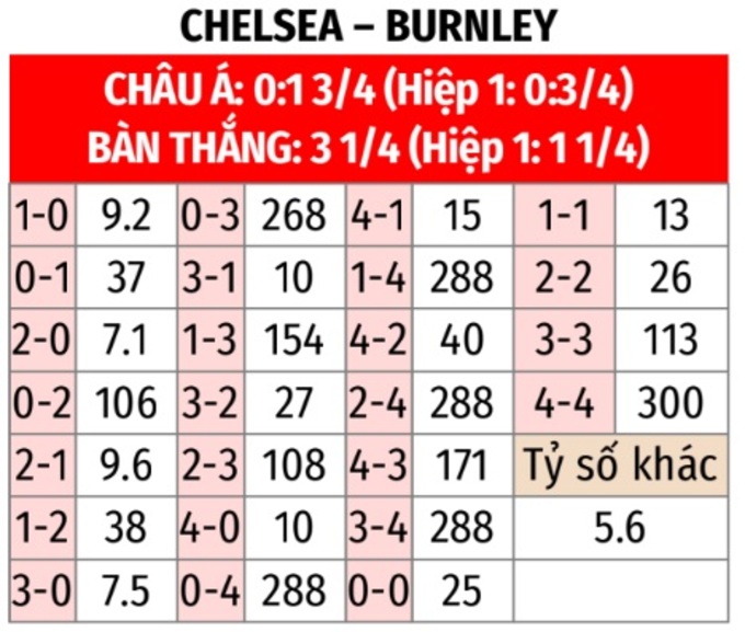 - Chẵn bàn thắng: 5/6 lần đối đầu giữa 2 đội gần đây kết thúc với tổng số bàn thắng là số chẵn. Tình trạng tương tự xảy ra ở 3 trận gần đây của Chelsea và 9/12 trận vừa qua của Burnley.