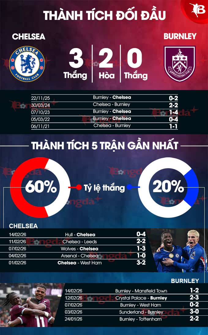 Tóm lại, đây là trận đấu mà cơ hội giành chiến thắng của Chelsea là rất cao. Nếu còn hoài nghi, hãy nhìn vào đối đầu giữa 2 đội trong thời gian vừa qua. Theo đó, đội bóng thủ đô London bất bại trong 12 cuộc đụng độ vừa qua với Burnley, bao gồm 9 trận thắng và 3 trận hòa.