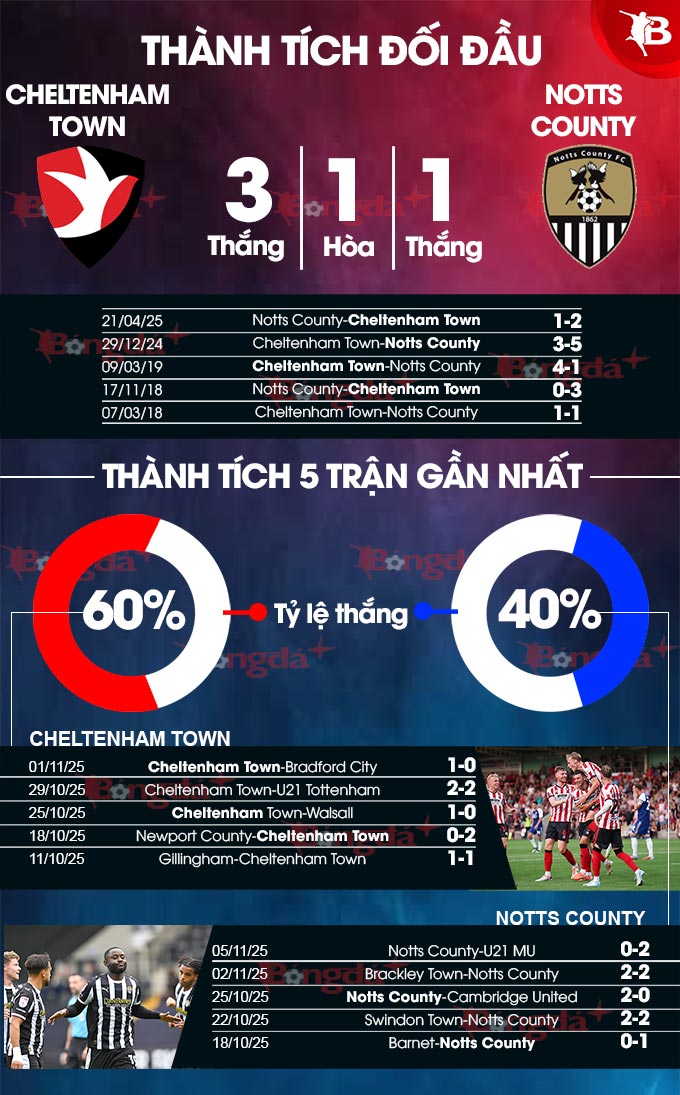 - Trên 2 bàn: 8/9 trận gần đây giữa Cheltenham Town và Notts County đều có trên 2 bàn. 6/8 trận sân khách vừa qua của Notts County số lần lưới rung cũng đều lên được tới ngưỡng 3.