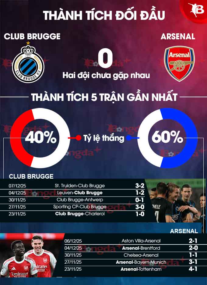 Với Arsenal, đội bóng của HLV Mikel Arteta đã chắc chắn có được một suất tham dự vòng play-off ngay cả trong trường hợp xấu nhất và đang hướng tới chiến thắng thứ 10 liên tiếp tại vòng bảng Champions League, cũng như trận đấu thứ 10 liên tiếp bất bại trước một câu lạc bộ Bỉ. Trong lịch sử, Arsenal chưa bao giờ giành chiến thắng trong 6 trận mở màn của mùa giải Champions League trong lịch sử, và các học trò của Arteta sẽ đến Bruges sau trận thua tại Premier League trước Aston Villa, trận thua chấm dứt mạch 18 trận bất bại và khiến họ phần nào đó mất đi sự tự tin khi chỉ còn hơn Man City 2 điểm trên bảng xếp hạng.