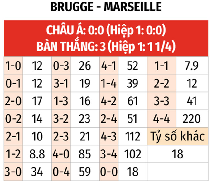 - Hiệp 1 có ít nhất 2 bàn thắng: 6 trận vừa qua của các cầu thủ Club Brugge đều kết thúc hiệp thi đấu đầu tiên với từ 2 lần lưới rung trở lên. Với Marseille, 3/4 trận vừa qua của đội khách cũng có ít nhất 2 bàn thắng trước giờ nghỉ.