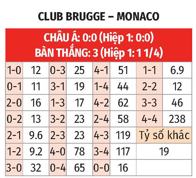 Club Brugge có lợi thế sân nhà và đang có thành tích bất bại ở 9 trận liên tiếp. Chiều ngược lại, Monaco lại không quá mạnh trên sân khách khi chỉ thắng ở 2/6 trận chính thức vừa qua. Có khả năng, 3 điểm sẽ ở lại với CLB của Bỉ.