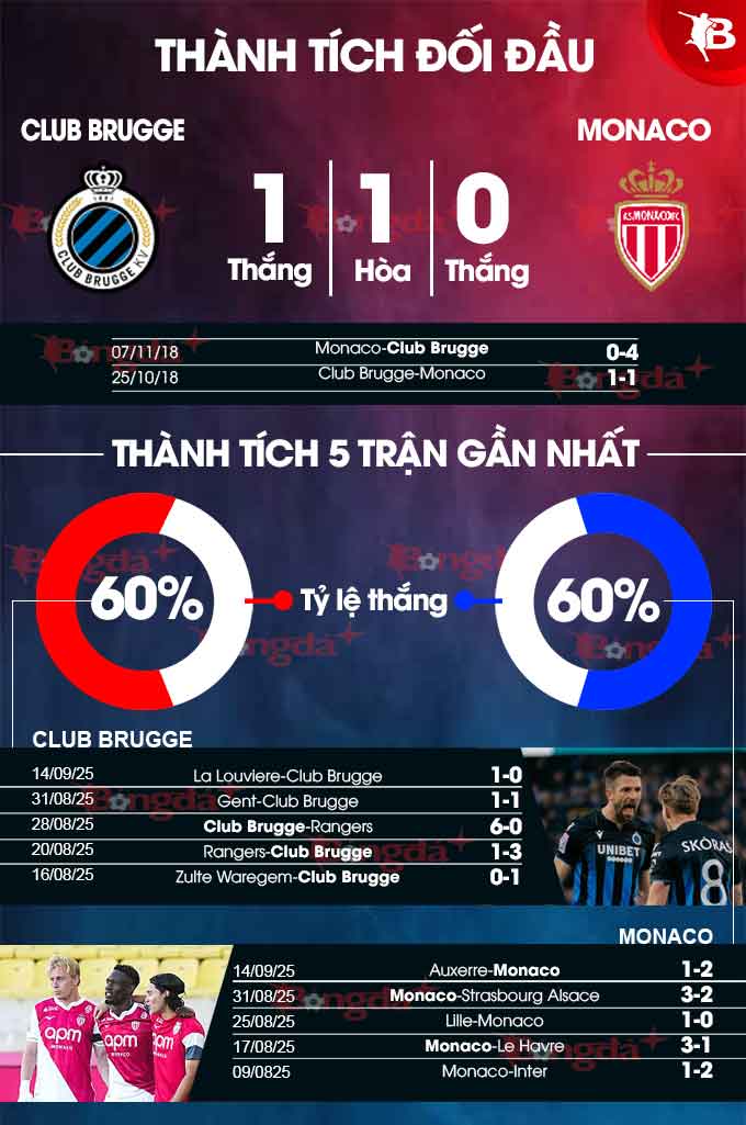 Hiện tại, phong độ của Club Brugge vs Monaco đang không quá chênh lệch. Trong khi Club Brugge thắng 4/6 trận gần nhất thì Monaco thắng 3/6 trận gần đây.