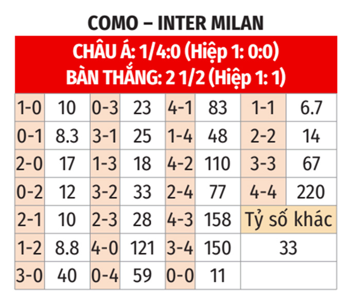 Với những phân tích nói trên, nhiều khả năng Inter sẽ thắng trận tại Como, ghi bàn trong hiệp 1 và không để thủng lưới lần nào.