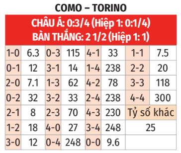 - Como thắng theo châu Á: Trong 6 trận sân khách gần đây ở Serie A khi được nhường 3/4 bàn trở lên, Torino thua theo châu Á 4 lần. Como thắng theo châu Á 4/6 trận sân nhà vừa qua tại Serie A khi nhường đối phương 1/2 trở lên. Trong 4 lần chạm trán gần nhất giữa đôi bên ở Serie A và B, Como giành 3 điểm và thắng theo châu Á ở 3 trường hợp.