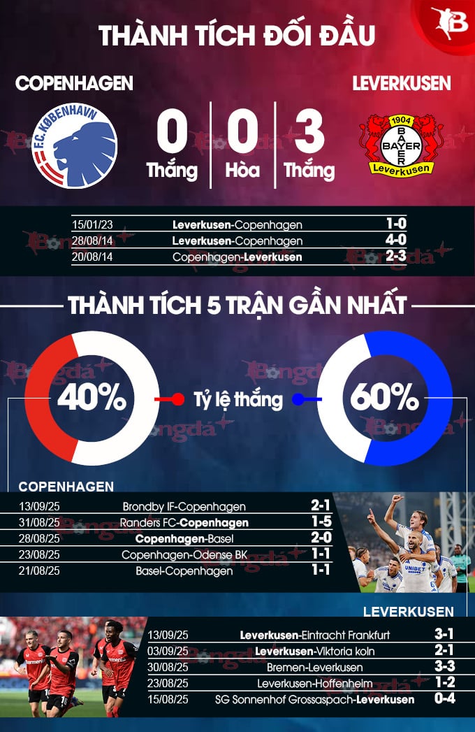 Nhìn vào quá khứ, có thể thấy Copenhagen là "con mồi" ưa thích của Leverkusen. Trong 3 lần chạm trán Leverkusen trước đây, đại diện Đan Mạch đều không tránh được thất bại. Tuy nhiên, bất chấp việc Copenhagen phải đối mặt với cái "dớp" đáng sợ, những người ủng hộ đội bóng này cũng không cần phải quá hoang mang.