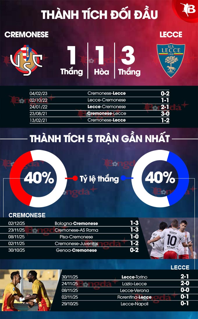 Cần nhấn mạnh rằng, sau khi giành chiến thắng ở trận chung kết play-off thăng hạng mùa giải trước, chiến dịch trở lại đấu trường cao nhất Italia của Cremonese bắt đầu với chỉ 1 trận thua trong 9 trận mở màn, nhưng lại toàn thua 3 trận liên tiếp trong tháng 11. Chính vì thế, thắng lợi trước Bologna ngay đầu tháng 12 chắc chắn sẽ mang tới sự tự tin cần thiết cho đoàn quân HLV Davide Nicola ở màn tiếp đón Lecce với tham vọng tiếp tục giành trọn 3 điểm.