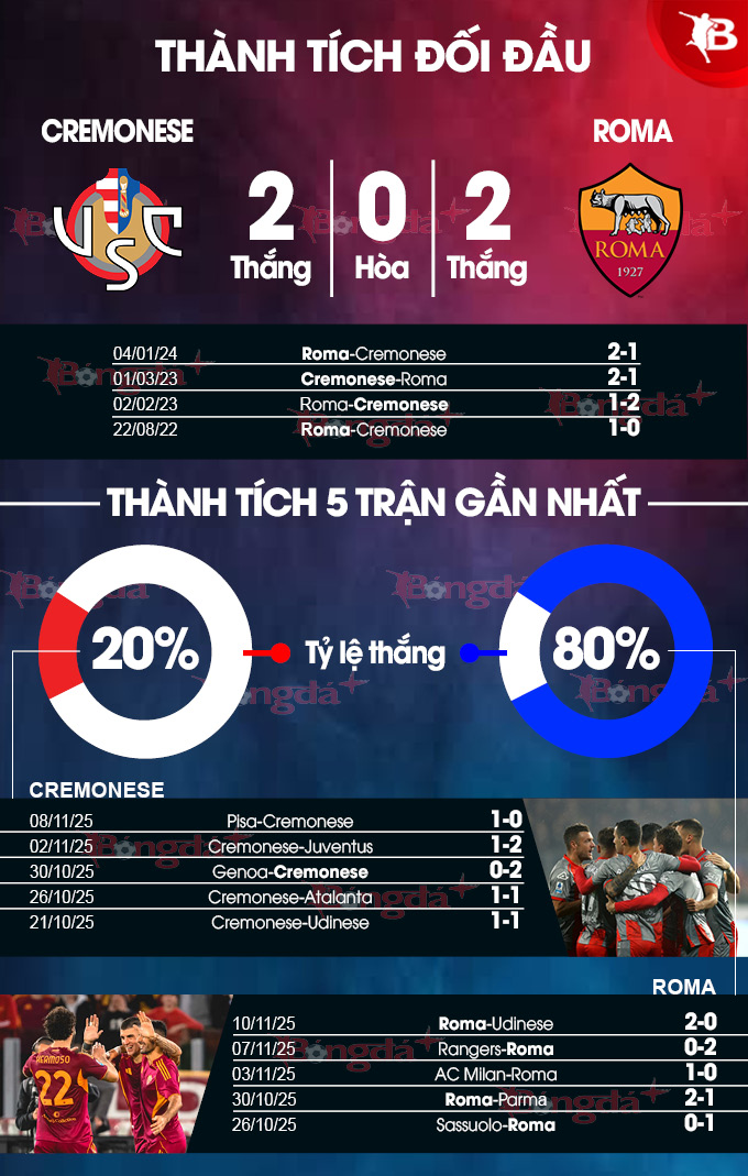 Trong quá khứ, Roma hễ gặp Cremonese là họ lại buộc đối phương phải nhận thất bại. Thói quen tích cực này cộng thêm phong độ tốt là điểm tựa để các vị khách tự tin sẽ kiếm trọn 3 điểm từ trận đấu tới.